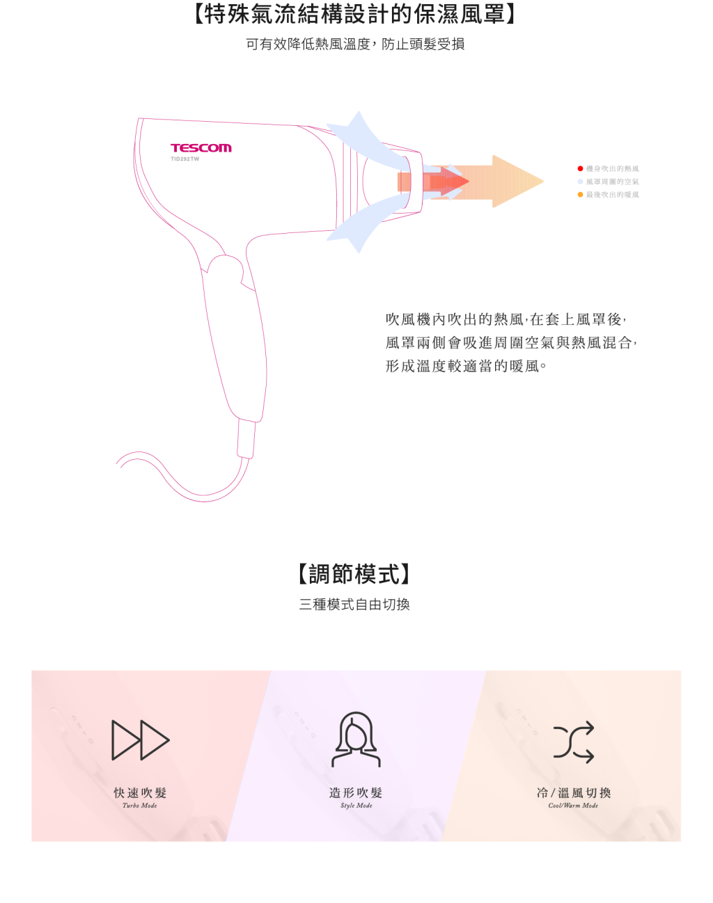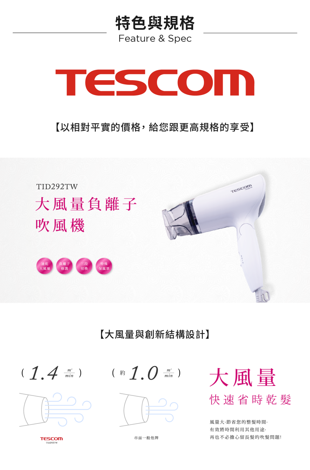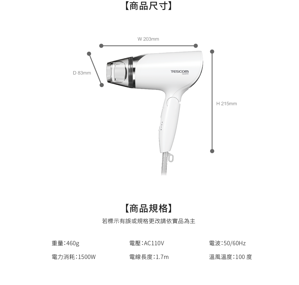 品牌:日本 TESCOM 型號:TID292 商品尺寸:H 215mm x W 203mm x D 83mm 產地:中國 電壓/輸出功率W:AC110V 60Hz 保固期限:一年 BSMI認證字號:R31310