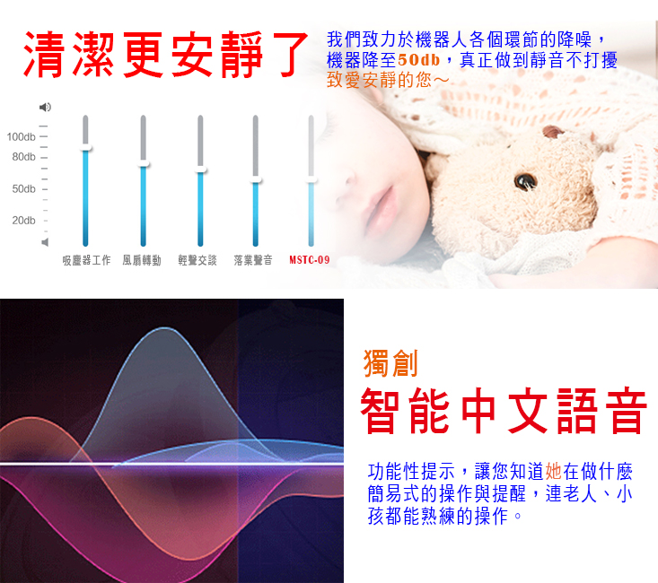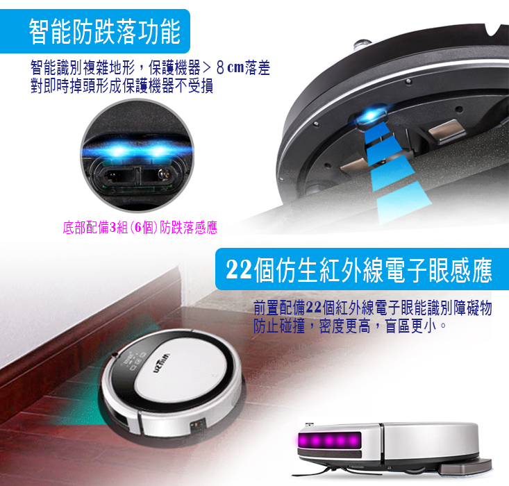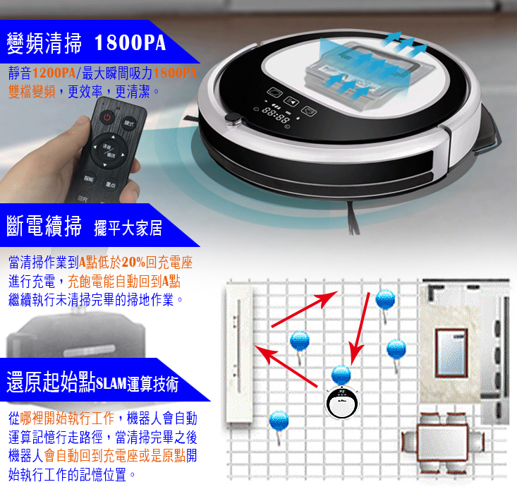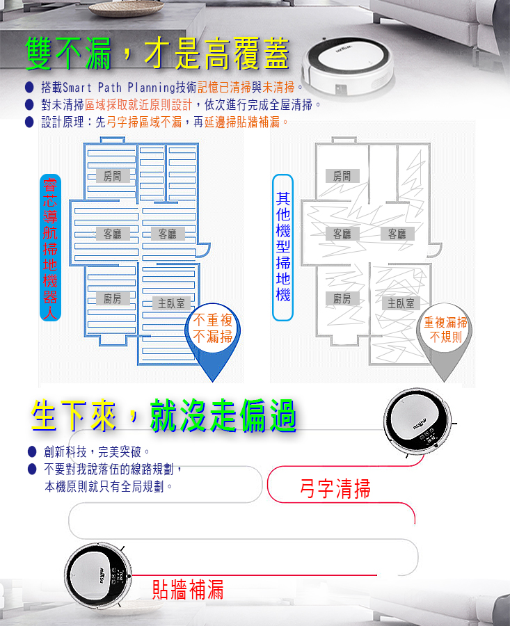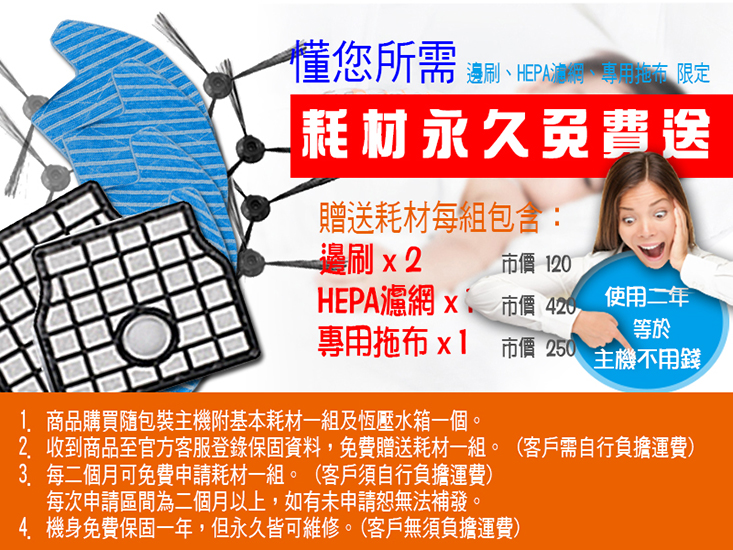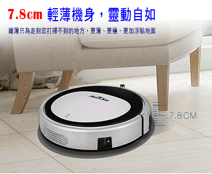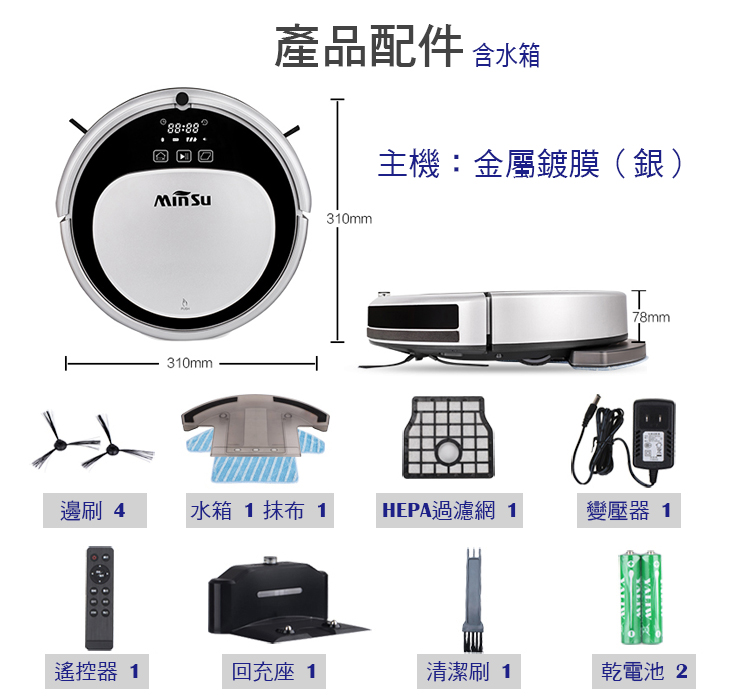 商品:高階導航智慧掃地機器人 品牌:MINSU 型號:MSTC-09 顏色:銀(金屬鍍膜) 規格:31 x 31 x 7.8 cm 吸力:1200 / 1800 變頻 淨重:2.1 Kg 電池:2000 mAh 動力型高效鋰電 充電時間:3-4 小時 工作時間:120-150 分鐘 集塵盒:500 ml 清掃模式:全局規劃 分區清掃 拖地功能:恆壓水箱 乾濕二用 自動充電:自動回充,斷電續掃 語音功能:智能中文語音提示 碰撞功能:22 個感應 + 碰撞保護 防跌落:6 個紅外感應 預約功能:有 紅外線遙控:有 自動脫困功能:有 自動斷電保護:有 電壓/輸出功率W:110~240V 主機工作電壓/功率:11.1V/600mA/20W 贈品:隨包裝贈:恆壓水箱 x 1 ,邊刷 x 2 ,HEPA過濾網 x 1,抹布 x 1 到貨登錄保固資料每間隔二個月可申請一次,每次贈一組:邊刷 x 2 ,HEPA過濾網 x 1 ,抹布 x 1 水箱材質/尺寸:聚丙烯酸樹脂/178x208 mm 濾網材質/尺寸:HEPA/133x123 mm 抹布材質/尺寸:不織布/178x208 mm 邊刷材質/尺寸:聚苯乙烯/120x120 mm ※附2顆4號電池 配件:主機,專用托布 x 1,遙控器 x 1,回充座 x 1,清洗刷 x 1,變壓器 x 1,邊刷 x 2,過濾網 x 1 保固期限:主機1年/鋰電池半年 有保固書/說明書